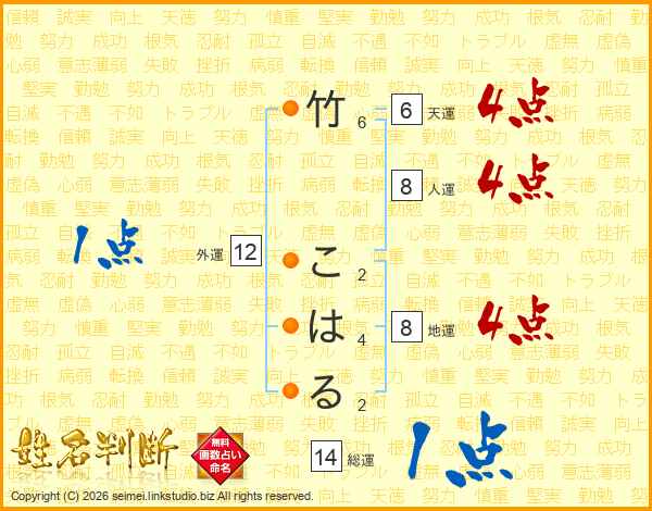 生活面を象徴する運勢です。外部から受ける影響力を表し、結婚運、家庭運や職場、環境への順応性を表します。総運から人運を引いた画数。姓や名が1文字の場合を除く。