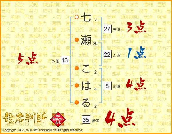七瀬こはるさんの外運は13画の5点!