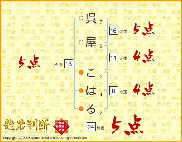 呉屋こはるさんの総運は24画の5点!