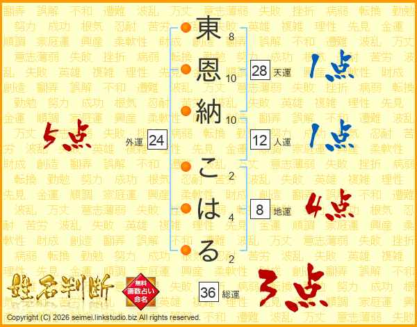 東(8画)恩(10画)納(10画) こ(2画)は(4画)る(2画)