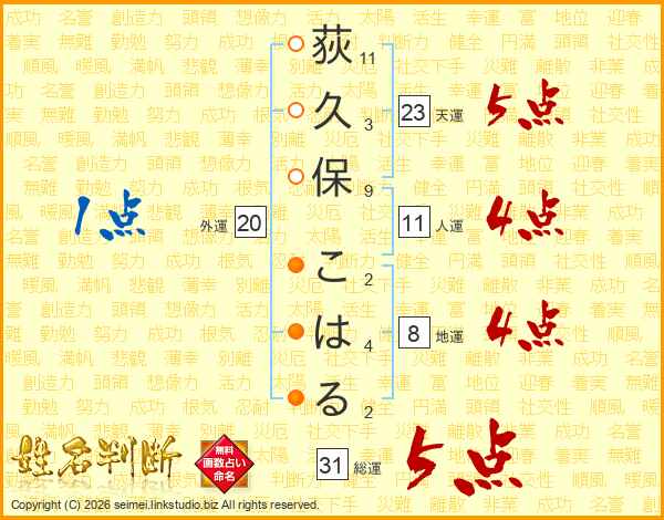 荻(11画)久(3画)保(9画) こ(2画)は(4画)る(2画)