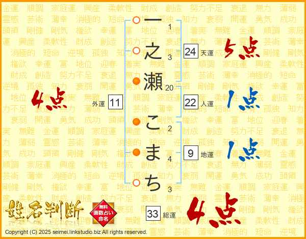 一(1画)之(3画)瀬(20画) こ(2画)ま(4画)ち(3画)