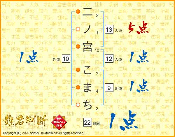 二(2画)ノ(1画)宮(10画) こ(2画)ま(4画)ち(3画)