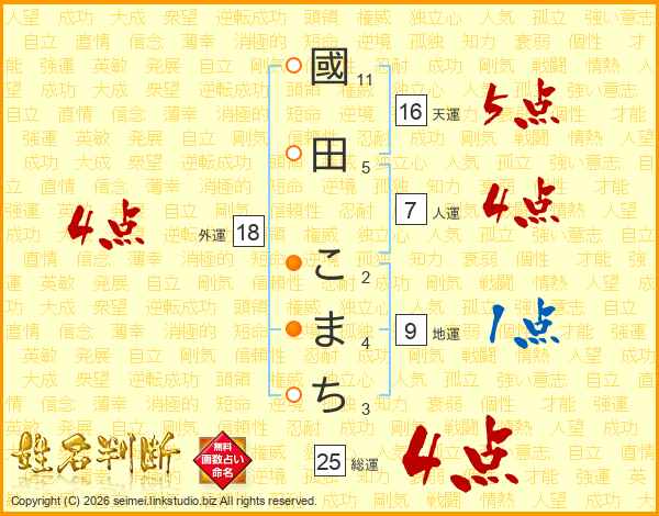 國田こまちさんの総運は25画の4点!