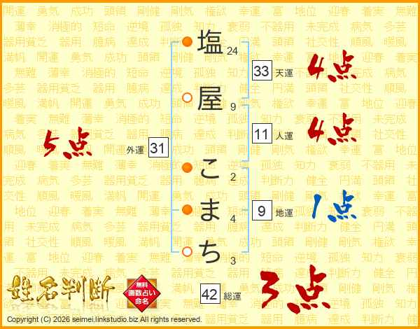 塩(24画)屋(9画) こ(2画)ま(4画)ち(3画)