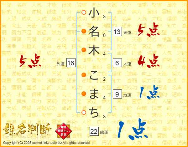 小名木こまちさんの総運は22画の1点!