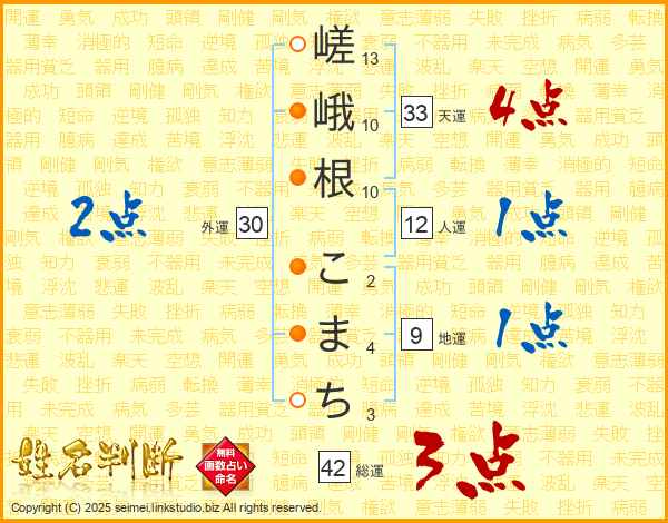 嵯(13画)峨(10画)根(10画) こ(2画)ま(4画)ち(3画)