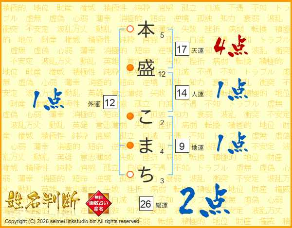 本(5画)盛(12画) こ(2画)ま(4画)ち(3画)