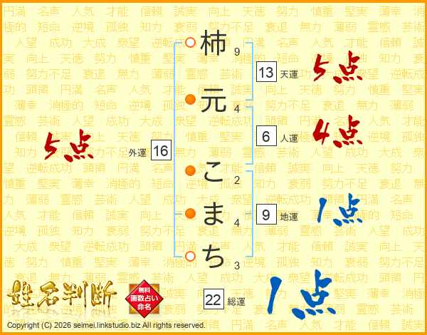 柿元こまちさんの天運は13画の5点!