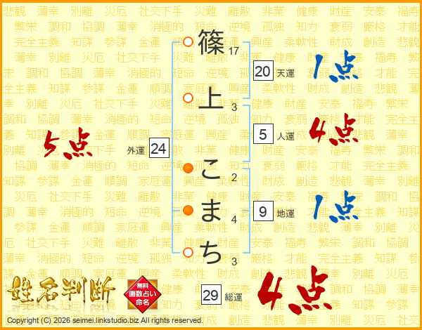 篠(17画)上(3画) こ(2画)ま(4画)ち(3画)