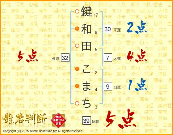 鍵(17画)和(8画)田(5画) こ(2画)ま(4画)ち(3画)