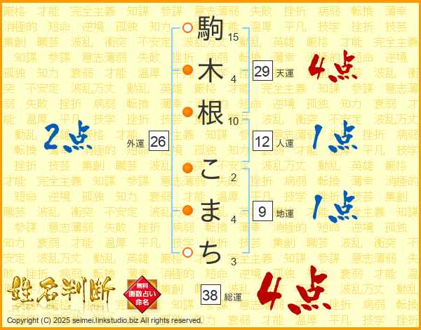 駒木根こまちさんの総運は38画の4点!