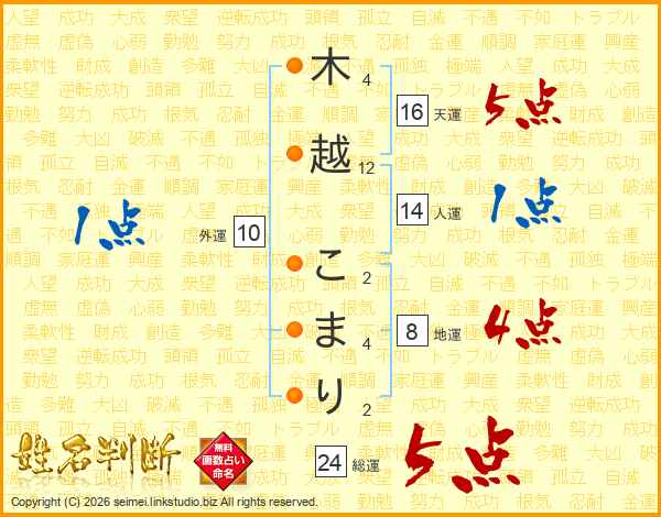 木(4画)越(12画) こ(2画)ま(4画)り(2画)