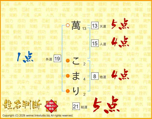 生活面を象徴する運勢です。外部から受ける影響力を表し、結婚運、家庭運や職場、環境への順応性を表します。総運から人運を引いた画数。姓や名が1文字の場合を除く。