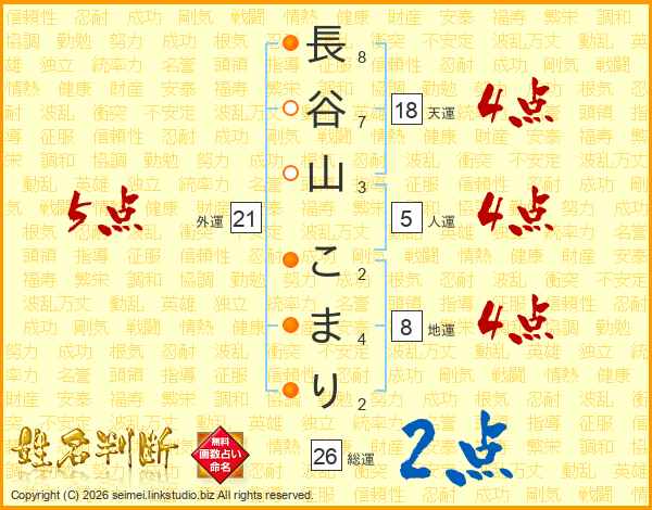 あなたの人生を表す1番重要な運勢です。生涯を通じて影響する総合運となり、主に50歳以降の晩年期に影響を及ぼします。苗字と名前の合計画数。