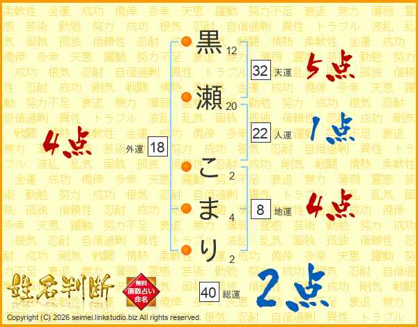 黒瀬こまりさんの総運は40画の2点!