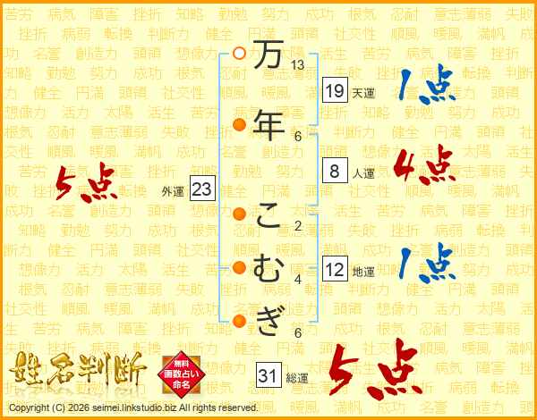万(13画)年(6画) こ(2画)む(4画)ぎ(6画)