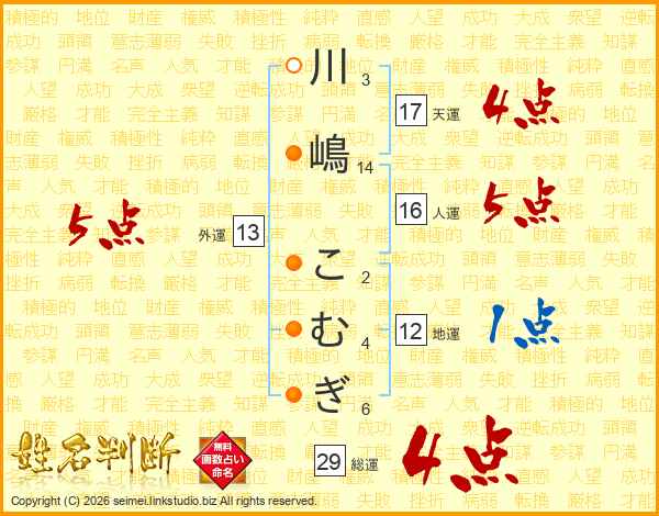 川(3画)嶋(14画) こ(2画)む(4画)ぎ(6画)