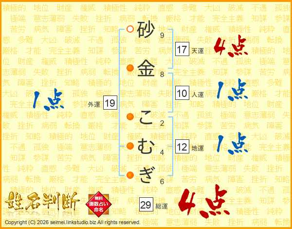 砂(9画)金(8画) こ(2画)む(4画)ぎ(6画)