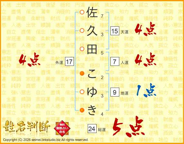 佐久田こゆきさんの人運は7画の4点!