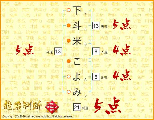 生活面を象徴する運勢です。外部から受ける影響力を表し、結婚運、家庭運や職場、環境への順応性を表します。総運から人運を引いた画数。姓や名が1文字の場合を除く。