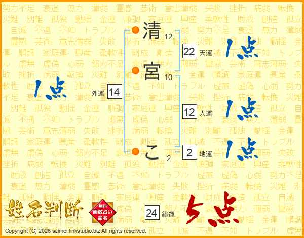 生活面を象徴する運勢です。外部から受ける影響力を表し、結婚運、家庭運や職場、環境への順応性を表します。総運から人運を引いた画数。姓や名が1文字の場合を除く。