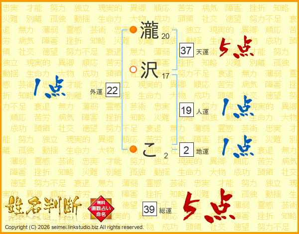 瀧沢こさんの総運は39画の5点!