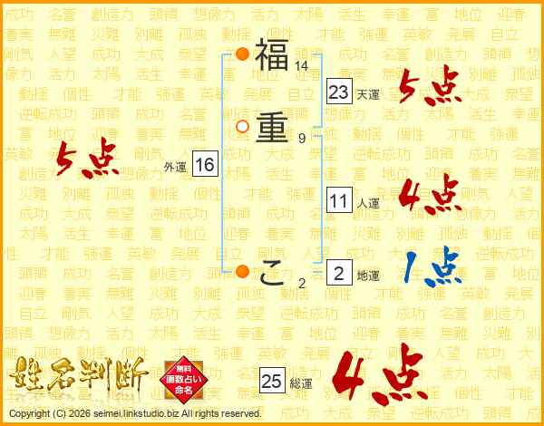 生活面を象徴する運勢です。外部から受ける影響力を表し、結婚運、家庭運や職場、環境への順応性を表します。総運から人運を引いた画数。姓や名が1文字の場合を除く。