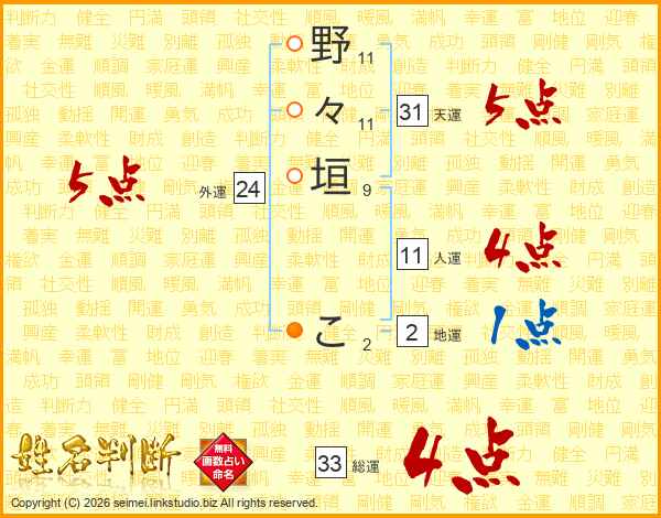 生活面を象徴する運勢です。外部から受ける影響力を表し、結婚運、家庭運や職場、環境への順応性を表します。総運から人運を引いた画数。姓や名が1文字の場合を除く。