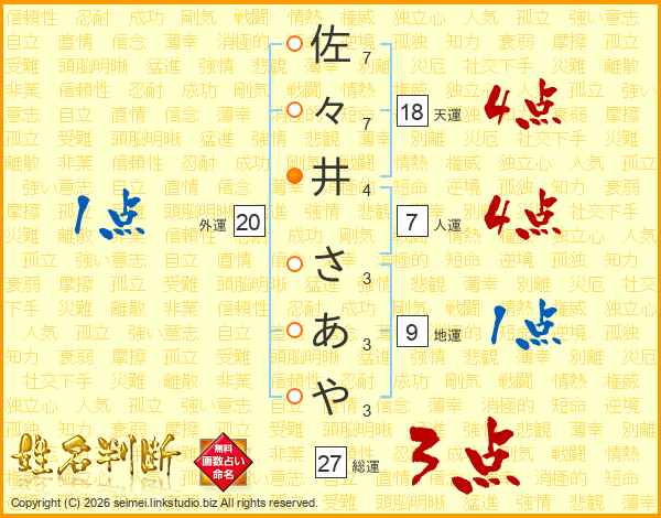 佐(7画)々(7画)井(4画) さ(3画)あ(3画)や(3画)