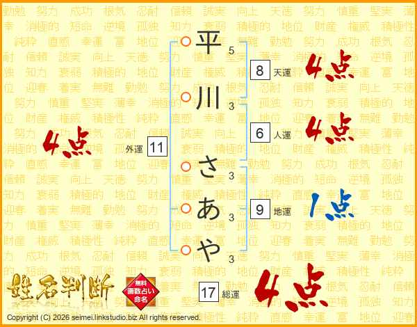 生活面を象徴する運勢です。外部から受ける影響力を表し、結婚運、家庭運や職場、環境への順応性を表します。総運から人運を引いた画数。姓や名が1文字の場合を除く。