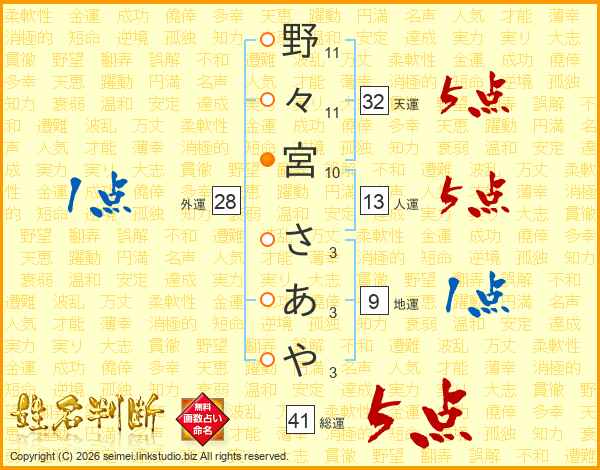生活面を象徴する運勢です。外部から受ける影響力を表し、結婚運、家庭運や職場、環境への順応性を表します。総運から人運を引いた画数。姓や名が1文字の場合を除く。