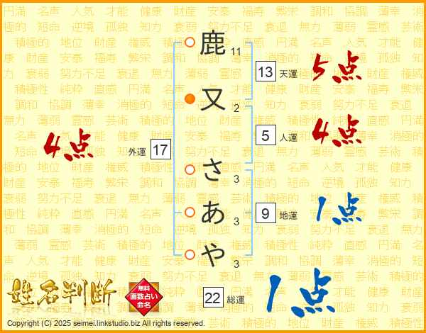 鹿又さあやさんの天運は13画の5点!