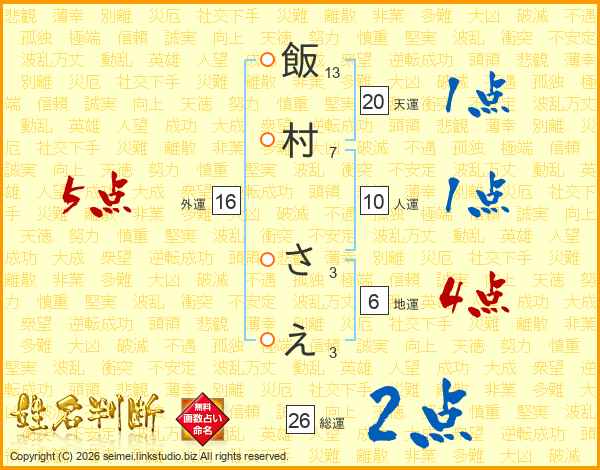 飯村さえさんの総運は26画の2点!