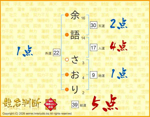 生活面を象徴する運勢です。外部から受ける影響力を表し、結婚運、家庭運や職場、環境への順応性を表します。総運から人運を引いた画数。姓や名が1文字の場合を除く。