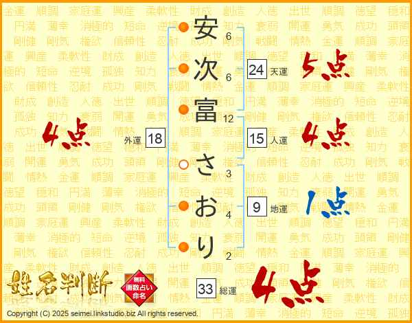 安(6画)次(6画)富(12画) さ(3画)お(4画)り(2画)