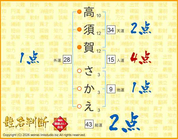 高(10画)須(12画)賀(12画) さ(3画)か(3画)え(3画)