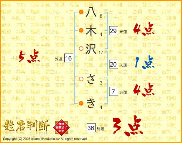 八(8画)木(4画)沢(17画) さ(3画)き(4画)