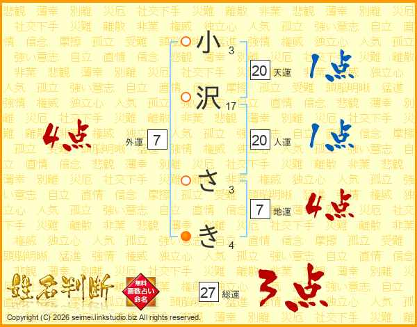 生活面を象徴する運勢です。外部から受ける影響力を表し、結婚運、家庭運や職場、環境への順応性を表します。総運から人運を引いた画数。姓や名が1文字の場合を除く。