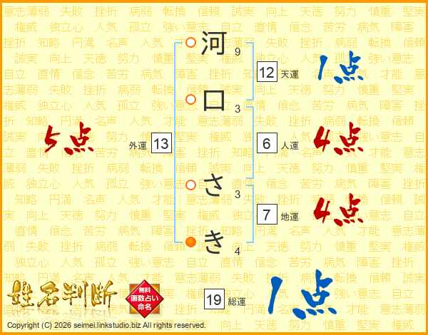 生活面を象徴する運勢です。外部から受ける影響力を表し、結婚運、家庭運や職場、環境への順応性を表します。総運から人運を引いた画数。姓や名が1文字の場合を除く。