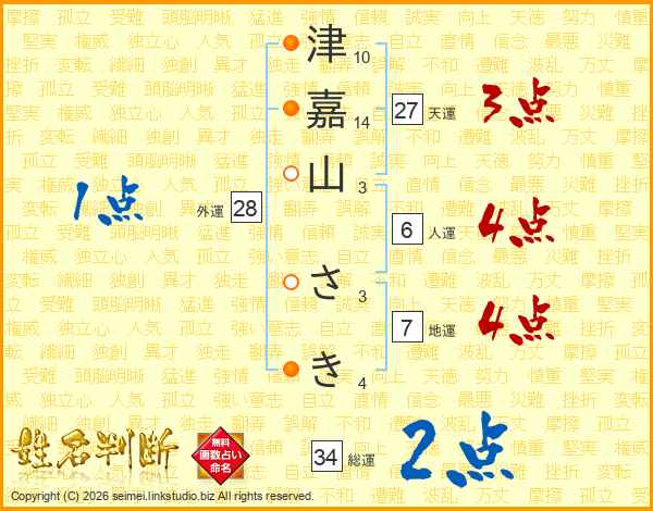 津(10画)嘉(14画)山(3画) さ(3画)き(4画)