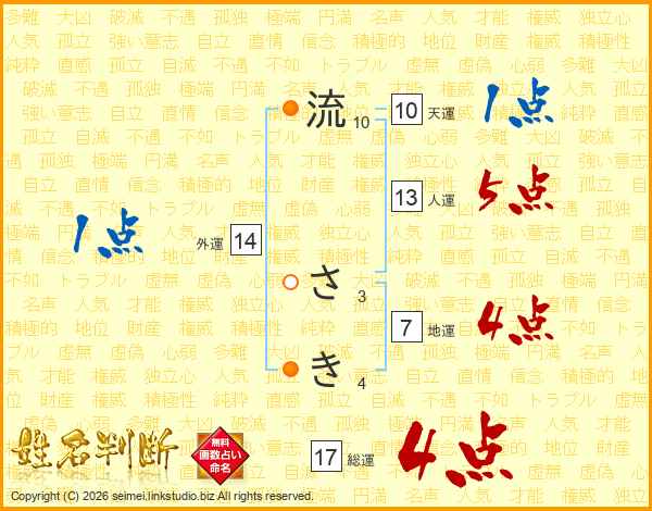 生活面を象徴する運勢です。外部から受ける影響力を表し、結婚運、家庭運や職場、環境への順応性を表します。総運から人運を引いた画数。姓や名が1文字の場合を除く。