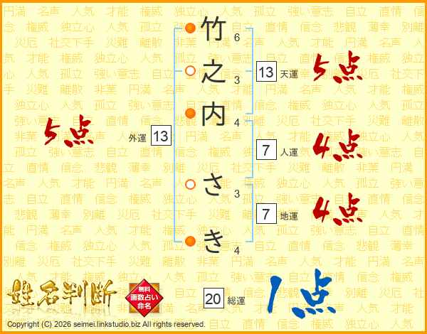 竹之内さきさんの天運は13画の5点!