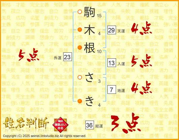 駒(15画)木(4画)根(10画) さ(3画)き(4画)