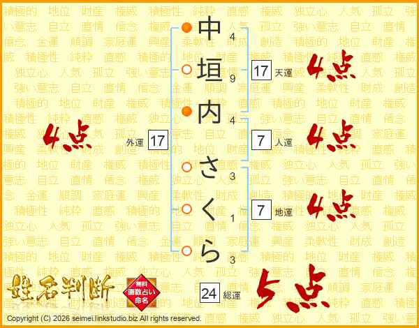 中(4画)垣(9画)内(4画) さ(3画)く(1画)ら(3画)
