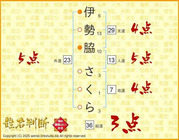 伊(6画)勢(13画)脇(10画) さ(3画)く(1画)ら(3画)