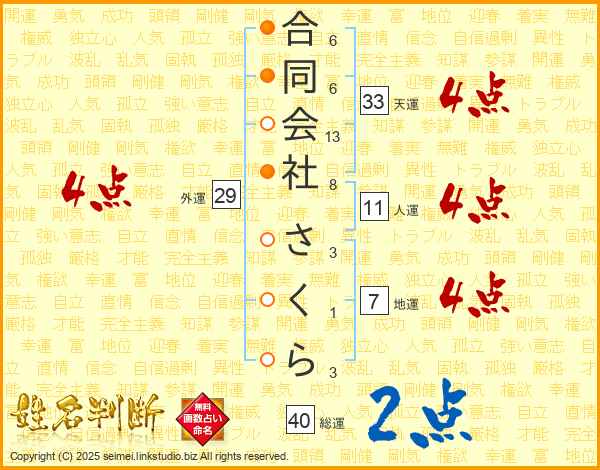 生活面を象徴する運勢です。外部から受ける影響力を表し、結婚運、家庭運や職場、環境への順応性を表します。総運から人運を引いた画数。姓や名が1文字の場合を除く。