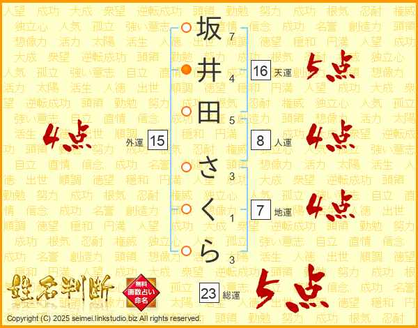 坂(7画)井(4画)田(5画) さ(3画)く(1画)ら(3画)