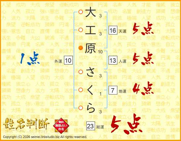 生活面を象徴する運勢です。外部から受ける影響力を表し、結婚運、家庭運や職場、環境への順応性を表します。総運から人運を引いた画数。姓や名が1文字の場合を除く。