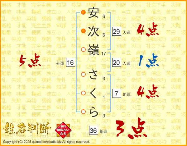 安(6画)次(6画)嶺(17画) さ(3画)く(1画)ら(3画)